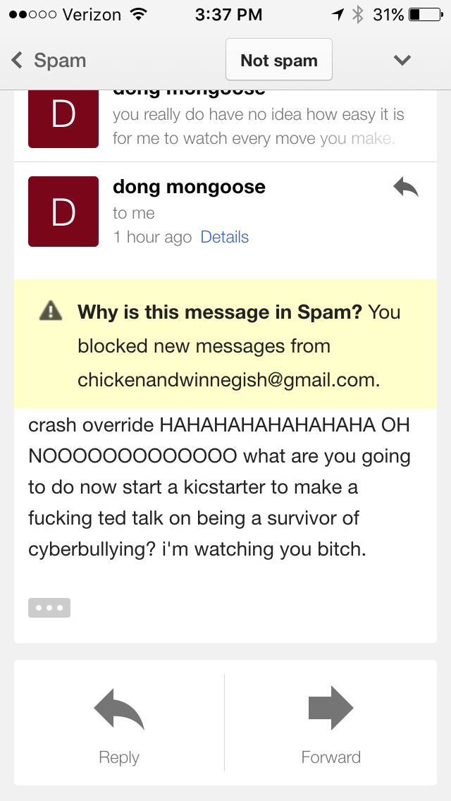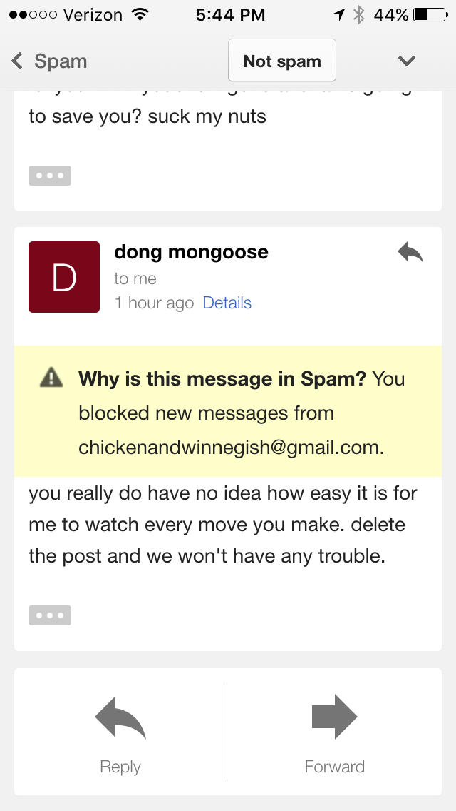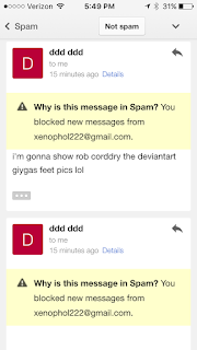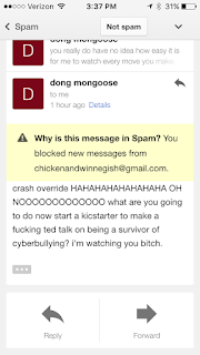 Within the next day, I get these threatening e-mails from Radock and Rokto - Rokto telling me that they were "going to kill me hahahahahaha." I posted about this in the General Chat thread on YouChew, which had been recently locked out to crawlbots and lurkers, and Rokto immediately mentioned that posting about the e-mails wasn't going to help much and that I was actually trying to become a professional victim because I mentioned that I was going to e-mail crash override. Radock would largely threaten to send Rob Corddry the imgur links while making jokes about how I was shit. Typical Radock super-obtuse-but-super-direct stuff. That's when I realized that they were doing this over the Rob Corddry endorsement update. Because the Twitter user I followed was one of their mutuals, they got mad when Weedhitler/LevarBurzum told them that I got Rob Corddry to follow her. And if Radock was going to Tweet/email the imgur links to Rob Corddry, who knows where she would've sent them to? Other members of the production? The submissions line for Tammy Smith Casting? Friends of mine on the production? I played around with the idea of filing a police report, but I realized that this had to be handled by one of their friends. I messaged both Weedhitler and other mutual Samanthuel Gillson (who you may remember from Hbomberguy's Donkey Kong 64 stream) copies of the e-mails, but of other threats both Radock and Rokto made towards me. They took my word seriously and within a day, not only did the e-mails stop, but all harassment ended. The past four years have had no harassment. I could finally leave this all behind.