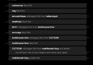 She found out when I made a call out post on Tumblr towards the three of them - this was around the time Doitch's two EPs he made under the name DBGE got a recommendation from Daniel Lopatin, otherwise known as Oneohtrix Point Never, and whose cassette release was being handled by Rokto, who had entirely switched over to the r8x0 moniker. I mentioned Lavagev's posts on the matter, I mentioned how Daniel Lopatin gave a glowing endorsement to my abusers, and I mentioned that ultimately, Radock and Rokto are just pathetic. They're using the last.fm raid to their benefit - using that intense shitposting to gain more inroads on the Internet. That's what I thought at the moment. Lavagev vagueposted about me cyberstalking her and immediately blocked me from accessing her Tumblr and Twitter. Radock and Rokto threatened me with actual violence this time - Radock in particular told me to "cut off each of [your] fingers and never type again." Rokto kept goading me on Twitter, asking me to remove this "obviously fake and slanderous post" about them.
