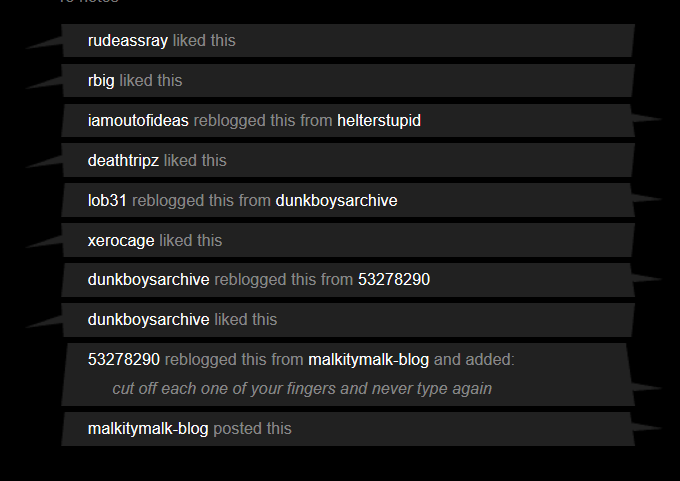 Radock, Rokto, Lavagev, and Doitch abused me on the Internet, the first two over a period of four to five years. I did stupid things in response - i.e. incessantly checking Lavagev's Tumblr in order to get any shred of evidence - but I still feel the effects of the harassment. I don't trust people too easily anymore. I feel like I'm more depressed than ever, just from the fact that I have this feeling that people that I'm cordial with secretly hate me. I've become more paranoid over the past few years. Every time somebody stops talking to me or unfriends me or blocks me, I keep thinking to myself, "is it because Radock got to them? Is the harassment continuing?" I still feel the hurt.
